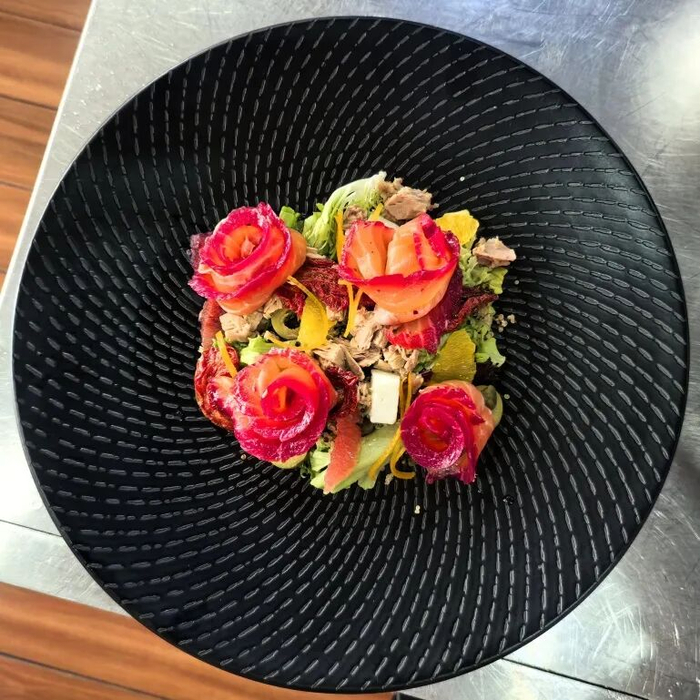 摆盘:盘中依次铺上混合生菜、藜麦、西柚橙肉、干番茄,码好三文鱼玫瑰卷,放上水波蛋。