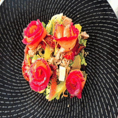 ■ 三文鱼花:腌制后的三文鱼切片,卷起后变成一朵玫瑰。