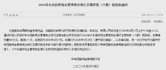 4月14日金融一线消息,为提高中央国库现金使用效益,加强财政政策与货币政策的协调配合,财政部、中国人民银行定于2026年4月17日上午9:50至10:20,通过中国人民银行中央国库现金管理商业银行定期存款业务系统进行2026年中央国库现金管理商业银行定期存款(六期)招投标。本期操作量800亿元,期限1个月,起息日为2026年4月17日,到期日为2026年5月15日(遇节假日顺延),以利率招标、单一价位中标方式面向中央国库现金管理商业银行定期存款业务参与银行进行招投标。招投标有关事宜按照《中央国库现金管理商业银行定期存款业务操作规程》、《中央国库现金管理商业银行定期存款招投标规则》及相关规定执行。