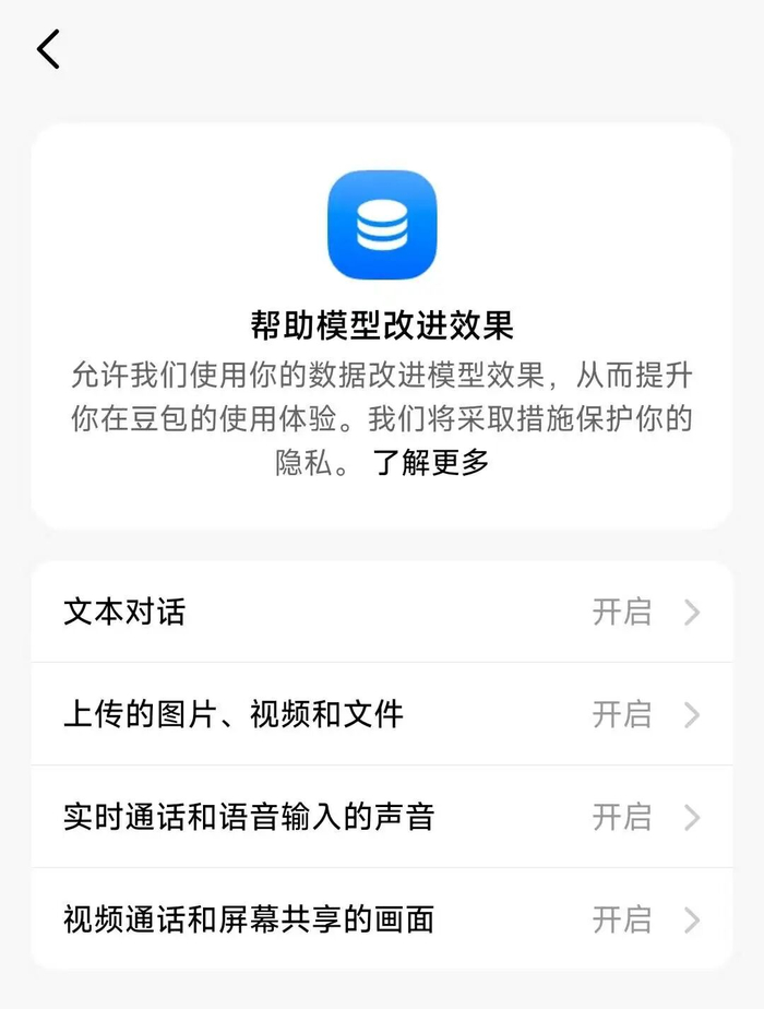 你现在马上打开手机,点开豆包,找到设置-隐私权限-帮助模型改进效果。如果你和我一样是全开启状态: