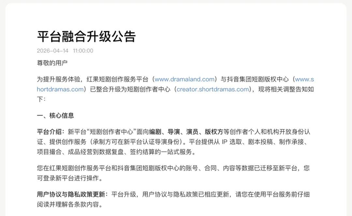 4月14日,抖音集团旗下“短剧版权中心”与“红果短剧创作服务平台”完成整合升级,统一为 “短剧创作者中心” (creator.shortdramas.com)。原两个平台的所有账号、合同、内容等数据已全部迁移至新平台,创作者可直接登录使用,无需重复入驻。