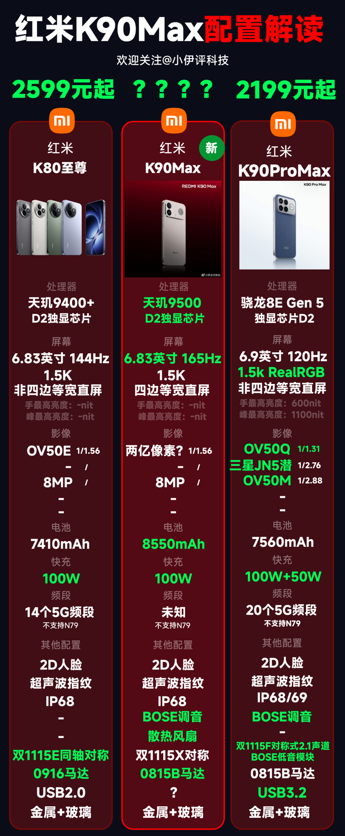 随着发布日的临近,红米K90Max的相关配置已经越来越清晰了,笔者也基于目前已知的一些配置信息给大家做一个横向的对比,对比机型主要是红米K80至尊以及红米K90ProMax。