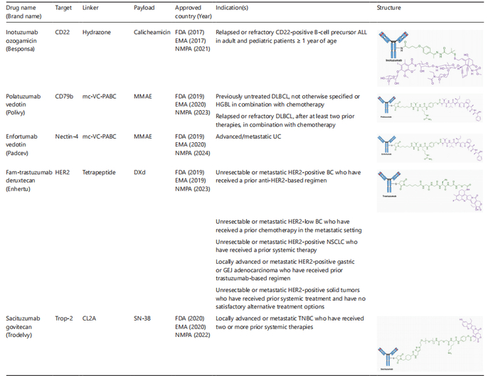 表1. 截至2025年12月FDA、EMA、NMPA 批准的ADC类药物汇总