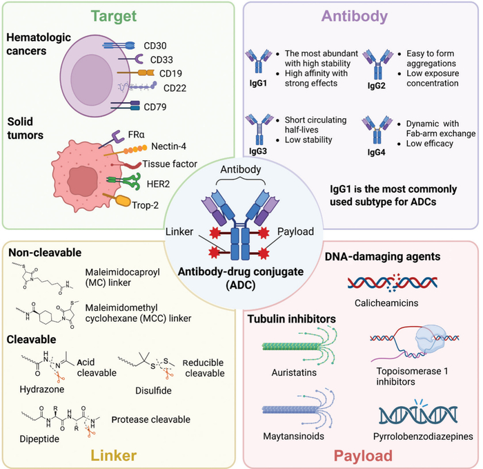 抗体(Antibody): 负责精准导航。理想的抗体应具备高亲和力、高特异性、低免疫原性和长半衰期。目前获批的ADC主要使用IgG1亚型。