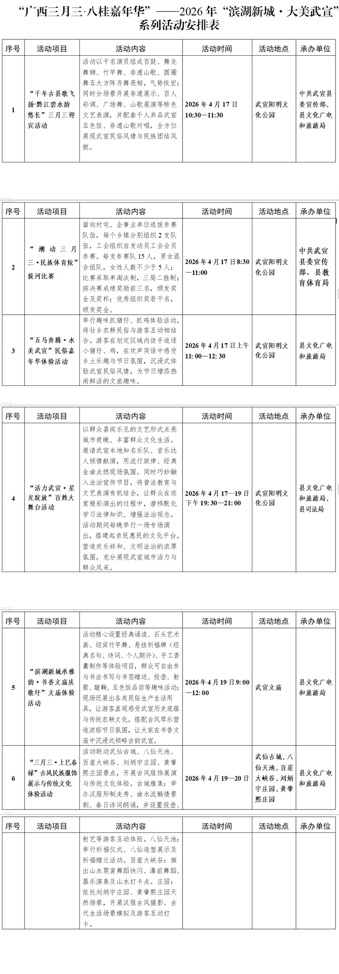 千年古县歌飞扬,黔江碧水韵悠长。2026年武宣县“滨湖新城 大美武宣”系列活动将于4月17日—4月20日举办,武宣精心策划并组织了一系列内容充实、形式多样的活动,六大主题活动轮番登场,一起来看详情亮点!