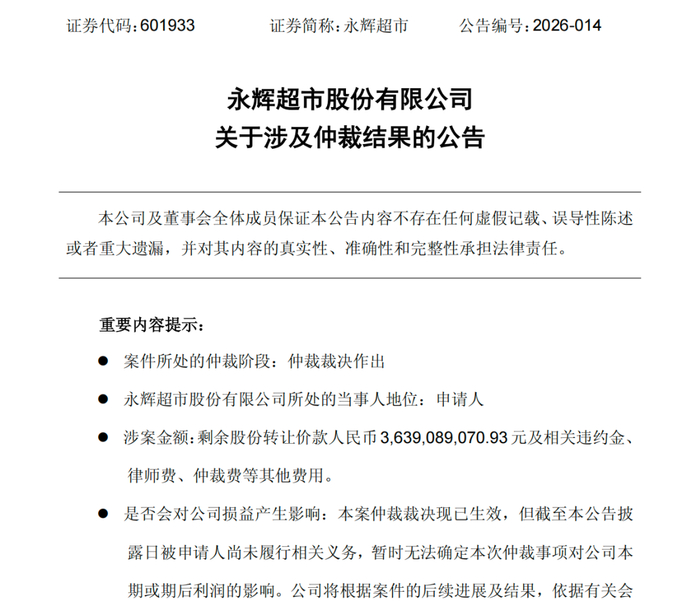 4月14日晚间,永辉超市(SH601933)发布公告称,近日收到上海国际经济贸易仲裁委员会(上海国际仲裁中心)(简称“上国仲”)送达的裁决书。
