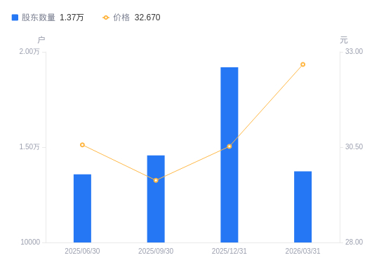 4月15日消息,数据显示,截至2026年3月31日,澳弘电子A股股东总户数为1.37万户,较上期(2025年12月31日)减少5462户,降幅28.46%。公司最新A股总股本为1.43亿股,其中流通A股1.43亿股,户均持有流通A股数量为1.04万股,较上期增加2962.55股,增幅39.78%;户均持流通A股市值34.01万元,较上期增加11.28万元,增幅49.63%。