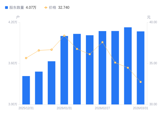 4月15日消息,数据显示,截至2026年4月10日,亿联网络A股股东总户数为3.96万户,较上期(2026年3月31日)减少1094户,降幅2.69%。公司最新A股总股本为12.67亿股,其中流通A股7.26亿股,户均持有流通A股数量为1.83万股,较上期增加492.99股,增幅2.76%;户均持流通A股市值63.56万元,较上期增加5.15万元,增幅8.82%。