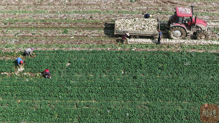 目前正值南充市嘉陵区河西镇萝卜丰收季,村民们在田间忙碌采收,呈现出一派热火朝天的丰收景象。村民们将地里的萝卜整齐装上拖拉机。几分钟后,这些萝卜就出现在全自动清洗机上,沿着传送带,从清洗机下来的萝卜瞬间变得干干净净。在分拣打包现场,工人们将清洗干净的萝卜依次分选、套袋、装箱、装车。这些打包好的萝卜当天就将运往湖北、广东、河北等地,每天发货80吨左右。