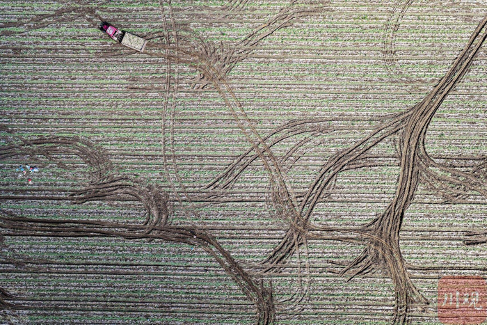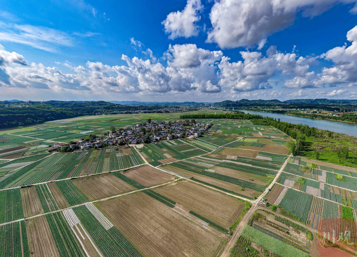 4月14日,从四川省南充市嘉陵区河西镇直属村上空俯瞰,位于嘉陵江畔的河西镇万亩蔬菜产业基地道路纵横交错、多种菜地整齐分布,犹如一幅色彩浓重的“彩色地毯”。