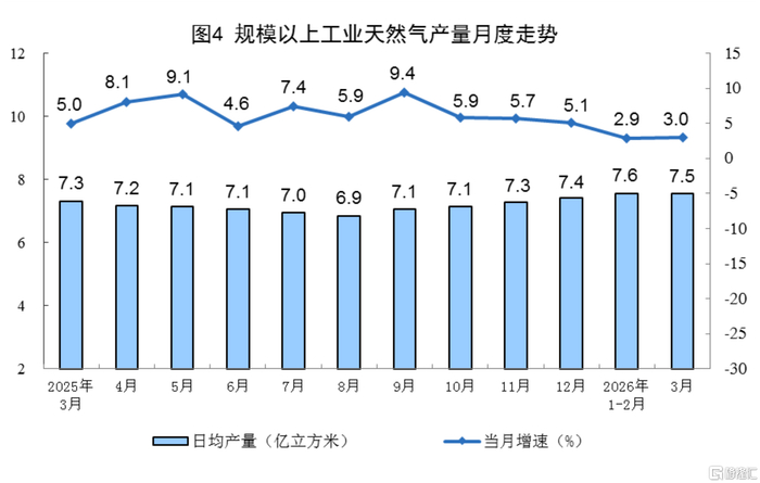 天然气生产增速加快。3月份,规上工业天然气产量234亿立方米,同比增长3.0%,增速比1—2月份加快0.1个百分点;日均产量7.5亿立方米。