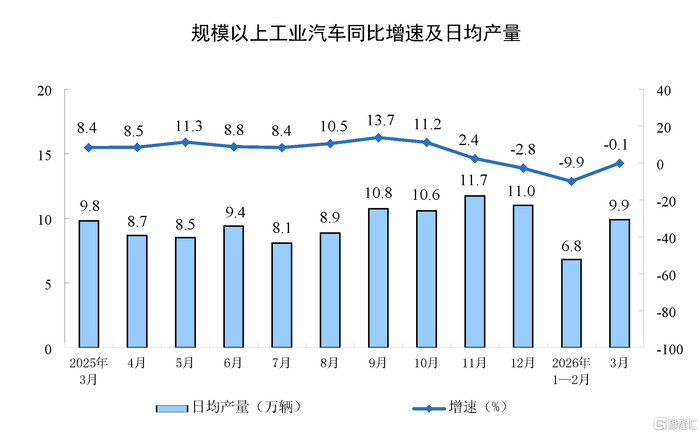 分产品看,3月份,规模以上工业626种产品中有329种产品产量同比增长。其中,钢材13098万吨,同比下降2.3%;水泥12310万吨,下降21.0%;十种有色金属707万吨,增长2.2%;乙烯364万吨,增长6.8%;汽车306.7万辆,下降0.1%,其中新能源汽车133.6万辆,增长1.2%;发电量8025亿千瓦时,增长1.4%;原油加工量6167万吨,下降2.2%。