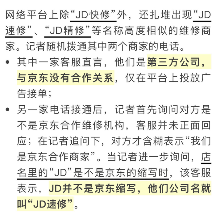 记者调查:“JD快修”与京东无关