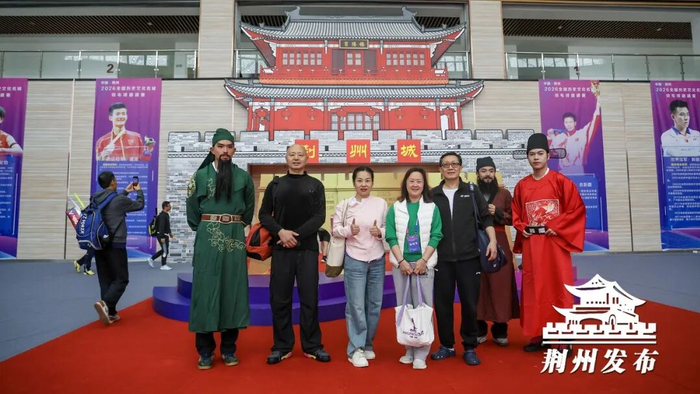 上午8点半,赛事场馆入口处,身着特色服饰的“荆州十二时辰”NPC十二星君热情迎接来自全国各地的球友。重庆宝瑞德羽毛球队队员熊小霞与队友兴致勃勃地与NPC合影互动,现场氛围轻松热烈。“太新奇了,感觉像穿越了,和关羽、刘备拍了照,我回去要告诉我的朋友,介绍他们到荆州来,不止是打球,还要来了解荆楚文化。”