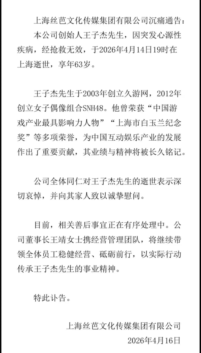 再后来,连选秀都没了。有办法的偶像改行当演员,没办法的偶像改行当主播。2022年,丝芭官宣进军元宇宙,要做虚拟偶像。2026年4月14日,王子杰因突发心源性疾病在上海逝世,享年63岁。