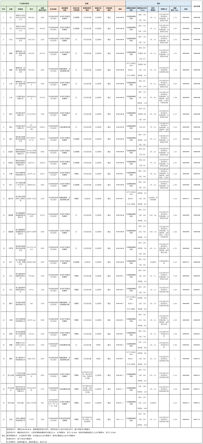 样品涉及☞ 本次受测样品由工作人员以普通消费者身份从电商平台选购,涵盖TCL、华为、小米、萤石、凯迪仕、松下、德施曼、鹿客等主流品牌,价格区间为936元至4500元。