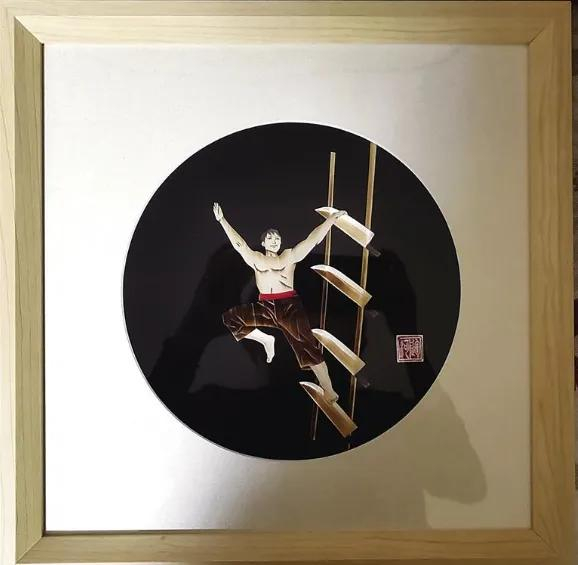 面塑、芦苇画、剪纸等工艺也各展所长,孙长胜的“文人八爱”系列面塑,以羲之嬉鹅、米芾拜石、东坡赏砚等为题材,将文人雅趣与杂技灵动气韵相融,人物神态刻画栩栩如生;郭学青的芦苇画系列包含《吴桥杂技系列》《狮子王》等,以运河芦苇为原料,将杂技经典场景与地域文化符号融入画面,芦苇的自然肌理与杂技的灵动姿态相得益彰。
