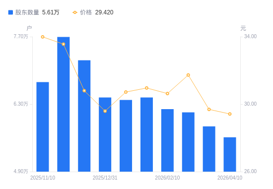 4月16日消息,数据显示,截至2026年4月10日,好上好A股股东总户数为5.61万户,较上期(2026年3月20日)减少2270户,降幅3.89%。公司最新A股总股本为2.98亿股,其中流通A股1.65亿股,户均持有流通A股数量为2933.12股,较上期增加114.35股,增幅4.06%;户均持流通A股市值8.63万元,较上期增加2603.18元,增幅3.11%。