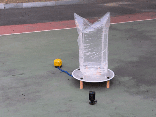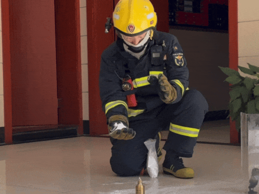 消防员脚踩打气筒快速打入空气,气流带起面粉形成粉尘云,使其扩散到密闭空间内。实验结果显示,当面粉粉尘达到一定浓度接触到明火,会瞬间燃烧,气浪能轻松冲开塑料袋。