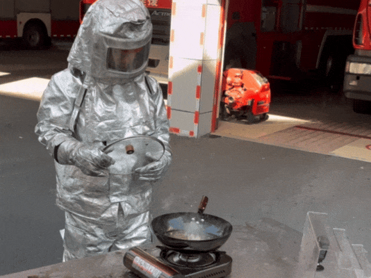 消防员将准备好的面粉从一定高度,分别散落到下方正在燃烧的酒精灯和卡式炉上方,模拟在不同火势下的燃气灶旁抖面粉袋的场景。