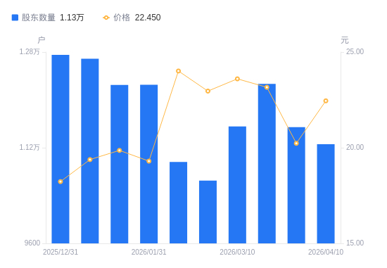 4月16日消息,数据显示,截至2026年4月10日,铭利达A股股东总户数为1.13万户,较上期(2026年3月31日)减少284户,降幅2.46%。公司最新A股总股本为4亿股,其中流通A股3.45亿股,户均持有流通A股数量为3.06万股,较上期增加753.25股,增幅2.52%;户均持流通A股市值68.73万元,较上期增加8.32万元,增幅13.77%。