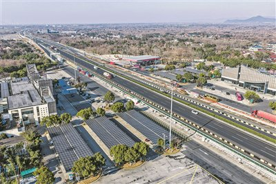 2026年1月7日拍摄的G50沪渝高速长兴服务区(无人机照片)。太阳能光伏板下是升级完成的高速服务区充电站。
