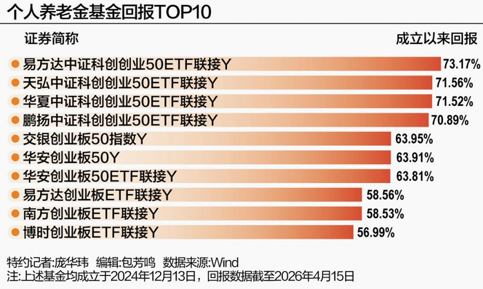 Wind数据显示,截至2026年4月15日,全市场312只个人养老金基金(Y类份额,下同)自成立以来平均收益20%,正收益比例高达99%,最高收益超70%。其中,个人养老金基金2025年平均收益17.56%,2026年平均收益2.68%。