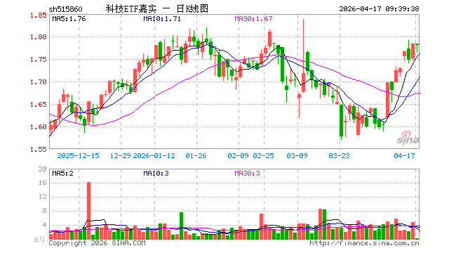 科技ETF嘉实(515860)开盘涨0.00%,重仓股海康威视跌0.15%,迈瑞医疗跌0.34%