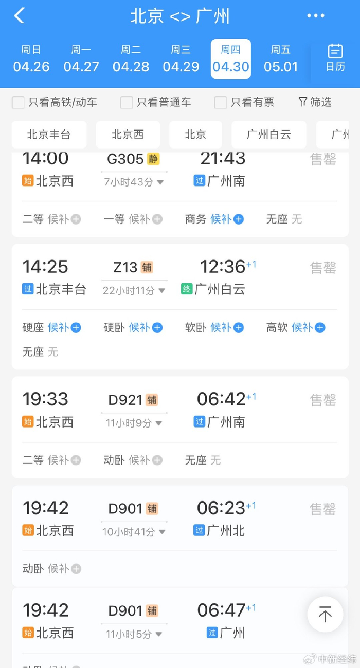 16日一早,中新经纬体验购买4月30日下午北京发往广州南的火车票,虽然提前预填了信息,但依旧开票即候补,选中的四条线路都秒售罄。