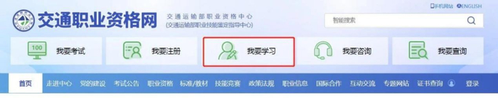登录“交通职业资格网”(https://www.jtzyzg.org.cn)首页,点击“我要学习”栏。