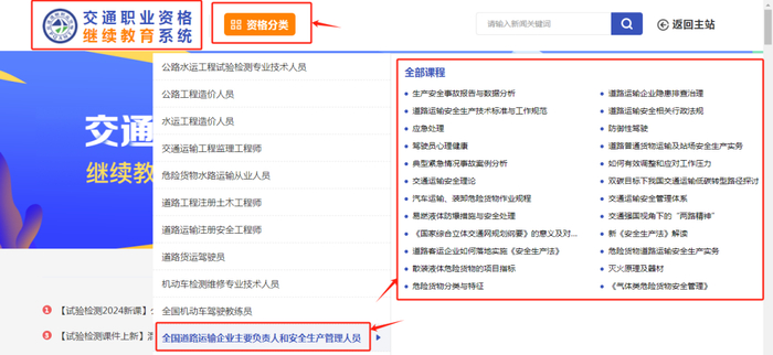 在“资格分类”中,点击“全国道路运输企业主要负责人和安全生产管理人员”,选择所学课程。