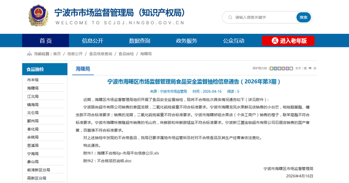 宁波市海曙区市场监督管理局食品安全监督抽检信息通告(2026年第3期)