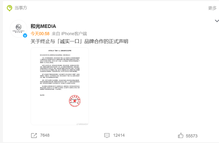鉴于上述品牌方严重违约及侵权事实,为坚决维护艺人的合法权益与人格尊严,和光传媒自本声明发布之日起,正式终止与诚实一口品牌的全部合作关系,撤销一切与该品牌相关的合作授权。