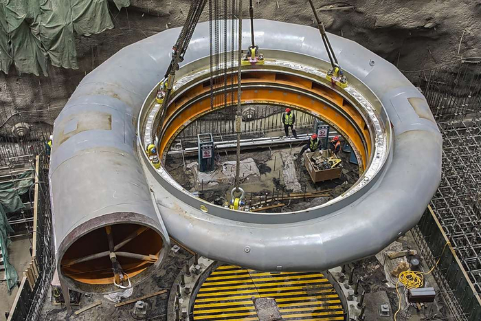 4月16日,工程人员在国网新源新疆哈密抽水蓄能电站主厂房内吊装首台机组蜗壳座。这一关键核心部件的精准落位,标志着电站机电安装工程取得阶段性突破,为后续机组埋件及主机设备安装奠定了坚实基础。该电站是新疆哈密新能源基地首座抽水蓄能电站。项目总装机容量120万千瓦,安装4台单机容量30万千瓦的可逆式水泵水轮发电机组,工程总投资82.3亿元,预计2028年全面建成投产。