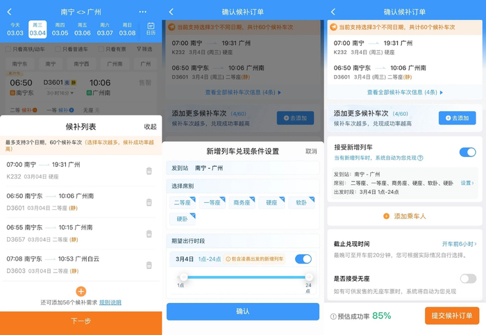 每名旅客可以保有6个待兑现的候补订单,每个候补订单最多可以添加19名乘车人,支持选择任意3个乘车日期,总计添加不超过60个车次,不再限制席别数量。如果旅客选择接受新增列车,还可以进一步提高候补成功率。