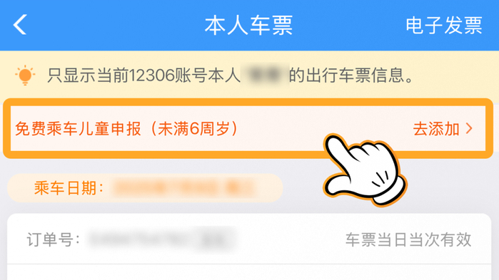 成人旅客购票后,可以点击【订单】-【已支付】,也可以点击【本人车票】找到申报入口,点击【免费乘车儿童申报】添加免费乘车儿童即可。