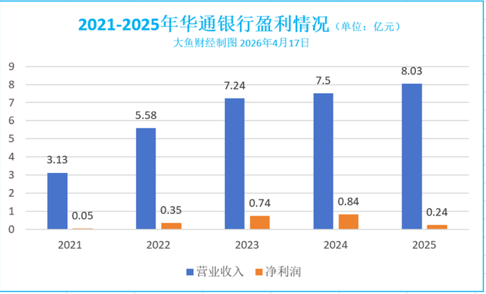 资产规模方面,截至2025年末,华通银行资产总计349.37亿元,同比下降4.93%;经营业绩方面,2025年华通银行实现营业收入8.03亿元,同比增长7.08%;实现净利润0.24亿元,同比大幅下降70.93%。