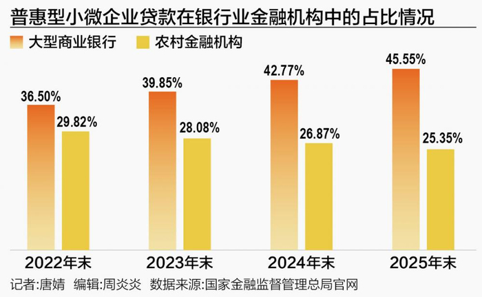 中国普惠金融研究院研究员汪雯羽告诉记者,自2019年起,监管部门对大行设定了“两增两控”等强制性、高增长的量化考核指标,这是推动大行加速下沉、市场份额快速提升的主要动力。尽管自2023年起,监管层面已不再对增速作硬性量化要求,但部分大行内部仍延续“普惠贷款年增速不低于30%”的考核标准,因此近两年来大行的市场份额仍在持续提升。