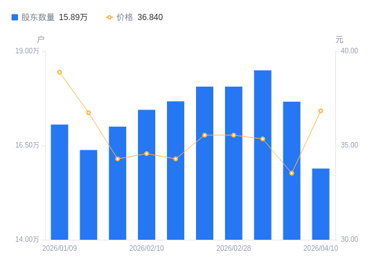 近一年(2025年4月10日至2026年4月10日),中航光电A股股东户数从6.19万户,增加至15.89万户,增幅156.63%,区间股价下跌12.58%。