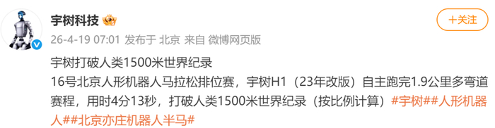 4月19日,宇树科技官方发布消息,在北京人形机器人马拉松排位赛中,宇树H1(23年改版)自主跑完1.9公里多弯道赛程,用时4分13秒,打破人类1500米世界纪录(按比例计算)。