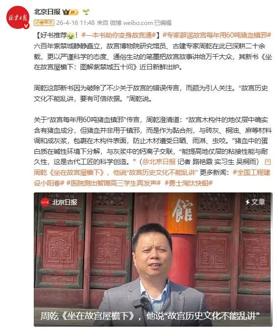 【故宫每年用60吨猪血镇邪?最新回应来了】故宫博物院研究馆员、古建专家周乾在新书《坐在故宫屋檐下:图解紫禁城五十问》破除了不少关于故宫的错误传言。关于“故宫每年用60吨猪血镇邪”传言,周乾澄清道:“故宫木构件的地仗层中确实含有猪血成分,但猪血并非用于镇邪,而是作为黏合剂,与砖灰、桐油、麻等材料调和成灰浆,包裹在木构件表面,防止木材遭受日晒、雨淋、虫咬。”猪血中的蛋白质在碱性环境下分解,与灰浆中的钙离子交联,“能提高地仗层的粘接性能与耐久性,这是古代工匠的科学创造。”