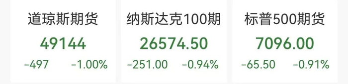 美股三大股指期货集体低开, 截至发稿, 道指期货跌1%,纳指期货、标普500指数期货跌超0.9%。