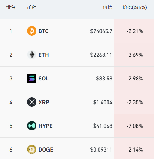 加密货币方面,主要币种集体下挫,比特币跌至7.4万美元附近,日内跌幅超2%。过去24小时,全市场超16万人爆仓。