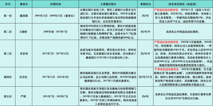 高管层面也难言轻松,自2005年至今,徽商银行先后经历了五位董事长,其中已有三人因涉嫌腐败问题接受调查。目前人事接续也成另一大问题,该行董事长职位在严琛2025年7月辞任后,已空缺逾八个月;董事会秘书一职自廉保华于2025年11月退休后,同样处于待补状态。