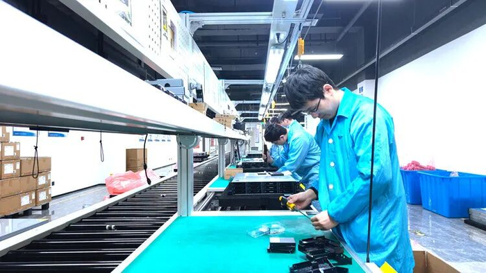 在联泰集群算力(三河)科技有限公司生产车间内,技术人员正在装配高性能计算服务器。