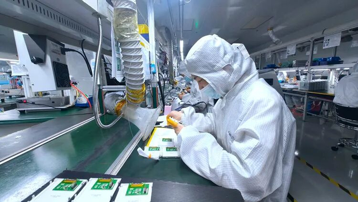 华田信科(廊坊)电子科技有限公司的工人正在进行显示屏外观检验。