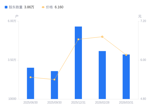 近一年(2025年3月31日至2026年3月31日),昇兴股份A股股东户数从3.26万户,增加至3.86万户,增幅18.43%,区间股价上涨5.66%。