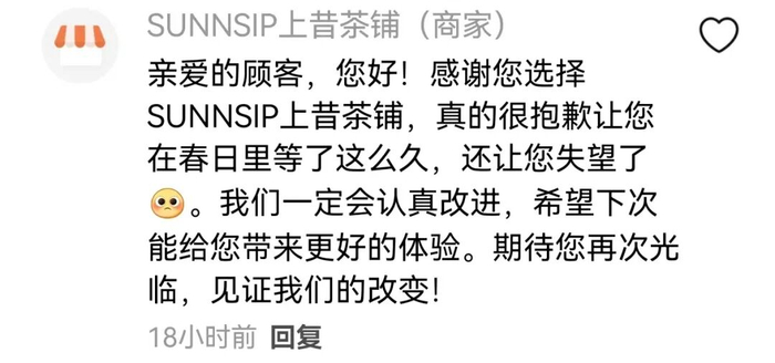 社交平台上,有网友称该店铺为“三里屯排队王”。也有网友曾因“排半天队,不给下单”给出差评。对此,商家回复表示:“真的很抱歉让您在春日里等了这么久,还让您失望了。我们一定会认真改进,希望下次能给您带来更好的体验”。