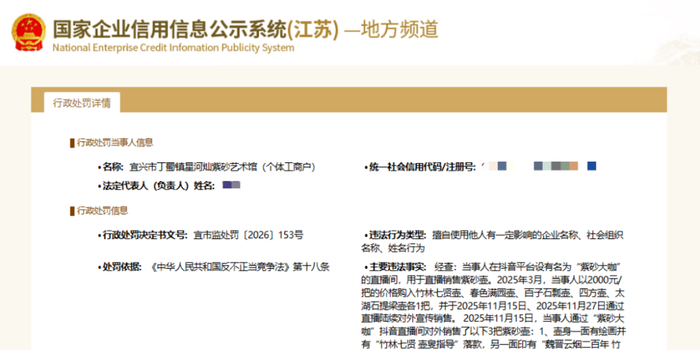 4月16日,记者从国家企业信用信息公示系统网站(江苏)获悉,江苏省宜兴市丁蜀镇星河灿紫砂艺术馆因擅自使用他人有一定影响的企业名称、社会组织名称、姓名行为被宜兴市市场监管局处罚。