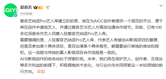 需要强调的是,入驻爱奇艺纳逗Pro艺人库,代表艺人有接洽AI影视项目的意愿,但是否参加某个具体项目、是否出演某个具体角色,都需要进行单独的商谈和授权。这一流程与传统的真人影视项目合作流程是一致的。